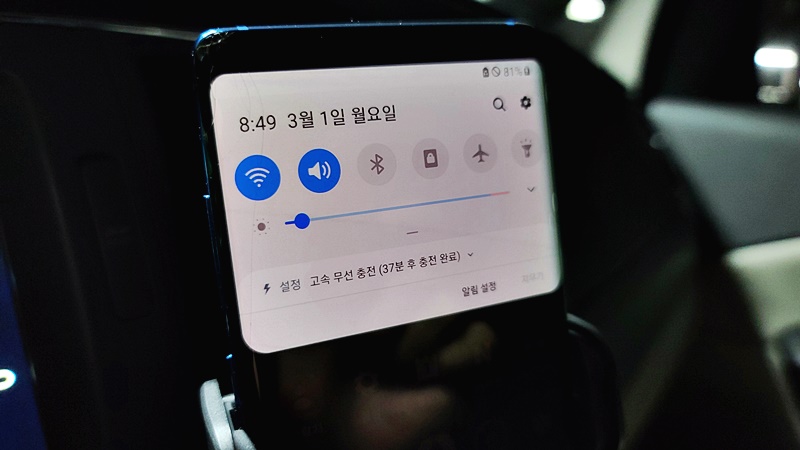 81% 충전이 되어 있는 상태에서 37분 충전 완료가 된다는 표시가 나옵니다. 실제로 운전을 하면서 테스트를 진행해보니, 100% 완전 충전이 될때까지 27분 정도 걸렸습니다. ( 충전 완료 예정 시간이 정확하지 않습니다). 최대 20W 고속 무선충전 차량용 휴대폰 거치대이기 때문에 더욱더 빠르게 충전이 되지 않았나 싶습니다.