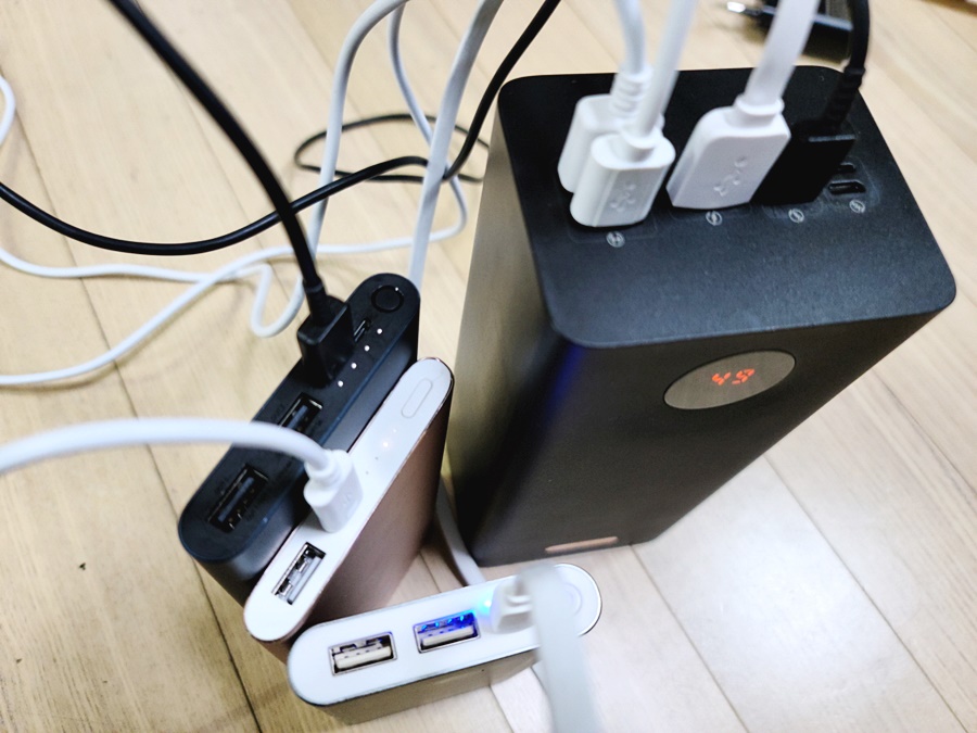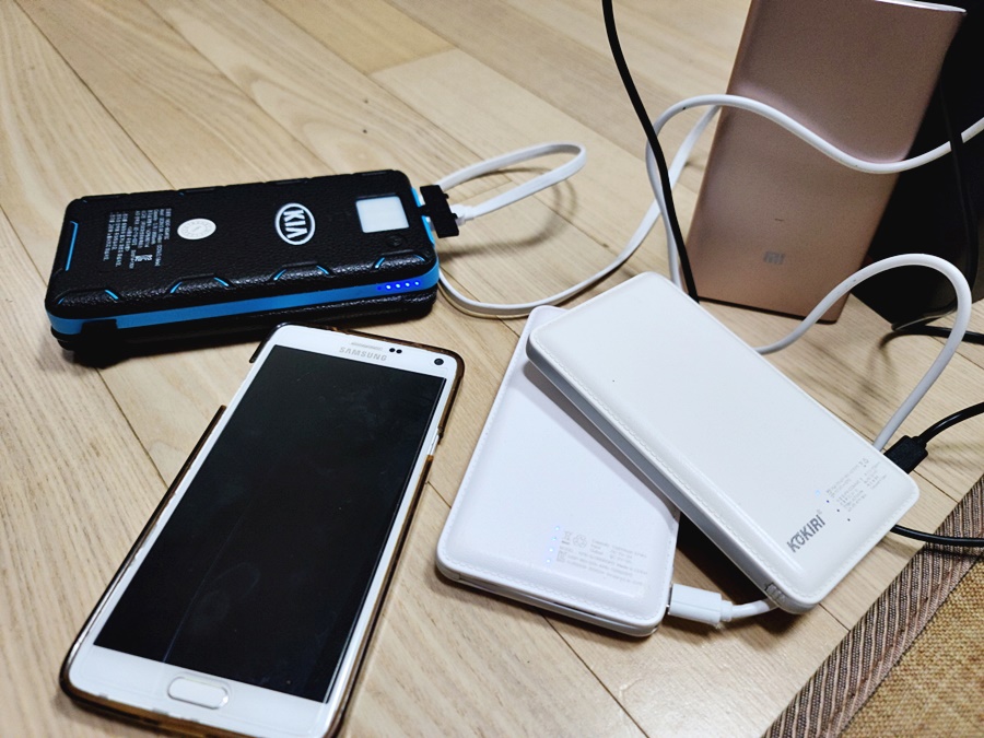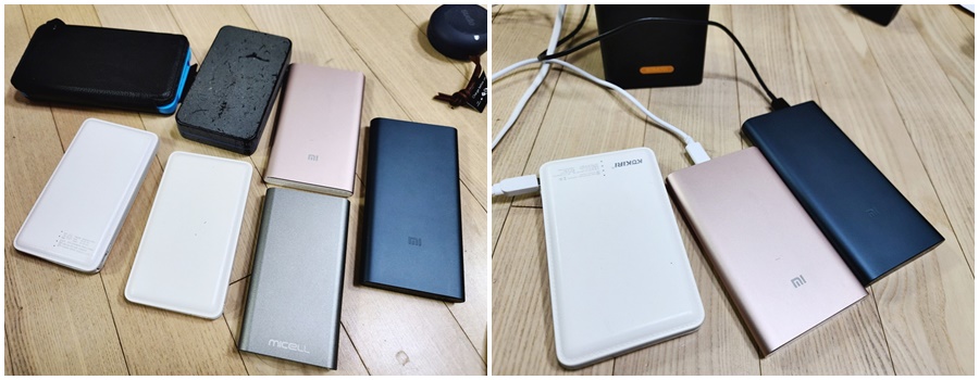 서랍에서 굴러다니는 보조 배터리들을 모여봤습니다. 이외에도 몇 개 더 있지만, 가장 많이 사용하고 있는 모델부터 충전을 시작해봅니다. 보조 배터리가 보조 배터리를 충전하는 상황입니다. 사진에 보이지 않지만, 최소 5개 정도 더 보유하고 있습니다. 보조배터리가 많아 지다보니, 주변 지인들에게 선물로 주기도 했지만 그래도 어느정도 여유있게 가지고 있습니다.