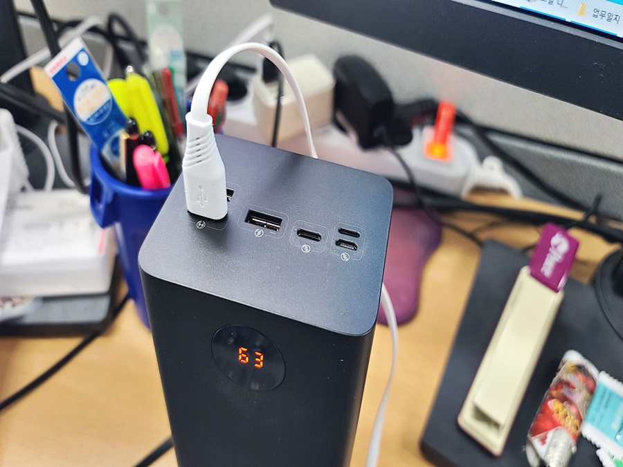 보조 배터리를 처음 개봉하면 65% 정도의 용량이 표시가 됩니다. 65% 표기에서 스마트폰을 연결후 충전을 진행하니 1시간도 안돼서 63%로 줄어들었습니다. 보조 배터리를 처음 사용하기 위해서는 완전 방전을 진행해야 합니다. 안전하게 사용하기 위한 과정이기에 완전 방전 후 충전을 진행해주셔야 합니다.