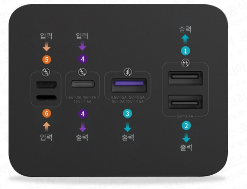 입력단자 2개, 입력 및 출력 겸용 1개, 출력 단자 3개가 배치가 되어 있습니다. 고속충전이 가능한 단자가 포함되어 있기에 보조배터리를 조금 더 빠르게 충전이 가능합니다. 고속충전이 가능한 QC 기술이 탑재가 되어 있습니다. QC 뿐만 아니라 DP 충전까지 지원되는 대용량 배터리입니다.