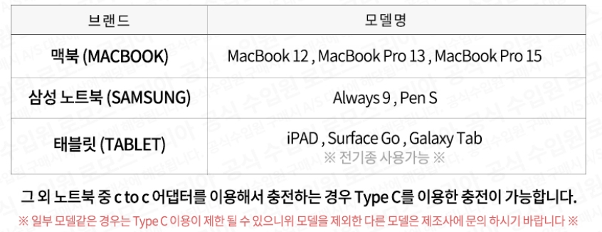 로모스 60000 보조 배터리는 22.5W를 지원하고 있기에, 일부 PD 충전이 되는 노트북 충전이 가능합니다. 노트북이 충전이 되기 위해서는 사용중인 노트북의 W를 필히 확인을 해야 합니다. 제가 가지고 있는 ACER 아스파이어5는 45.1W이기에 아쉽지만, 사용이 불가능합니다. 최신 사양의 노트북이라도 PD충전이 되지 않는 모델이 많기 때문에, 혹 노트북을 구매해야 한다면, PD충전이 되는 노트북을 선택하는 것도 최선의 선택일듯 싶습니다. 혹 최신 노트북이 아니라도 DP 젠더를 이용해서 충전은 가능하지만, 22.5W까지 지원을 되니 정격 출력을 확인하시고, 젠더( DP TO C) , 충전 케이블은 여유있게 65W이상으로 구해하시면 됩니다. 로모스에서 공식으로 충전이 가능한 노트북은 다음과 같습니다.