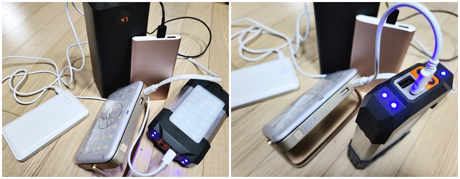 최근 캠핑장 예약하기가 워낙 어려워서 그런지 캠핑은 못 가고 대신 캠핑용품만 만지작 거립니다. 제가 사용하고 있는 충전식 랜턴을 충전을 해봅니다. 2박 3일 캠핑을 하게 되면, 1박 후에는 낮시간에는 충전을 해야 2일째 되는 밤에 사용할 수 있습니다. 랜턴의 경우 혹시 모르는 사태(?)를 대비해서 수시로 충전을 합니다. 전기가 되는 오토캠핑장 위주로 사용하고 있지만, 추후에는 노지에서 캠핑을 해보려고 합니다. 로모스 6000 배터리라면 노지 캠핑도 어렵지 않을 듯 싶습니다. 노지 캠핑을 하게 되면 랜턴, USB 매트, 스마트폰등 다양한 전자 기기들을 충전이 가능합니다.
