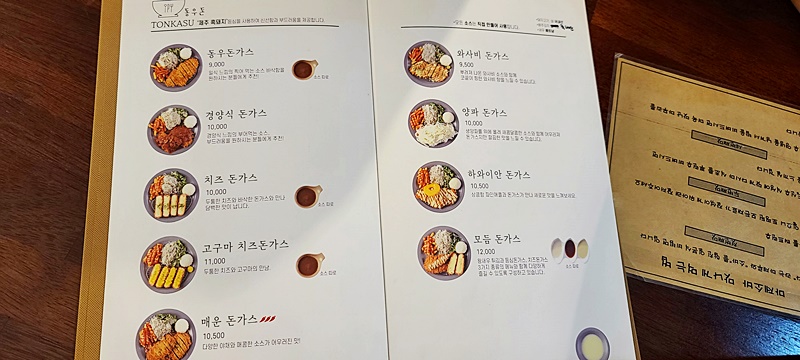 동우돈까스, 경영식 돈가스, 치즈돈가스, 고구마 치즈 돈가스, 매운 돈가스, 고추냉이 돈가스, 양파 돈가스, 하와이인 돈가스, 모둠 돈가스 등 다양하게 돈가스 종류가 준비되어 있습니다. 어떤 돈가스를 먹을까 고민을 해봤습니다.