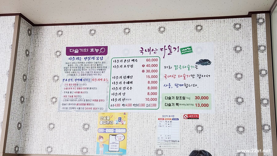 가장 많이 드시는 다슬기 수제비, 다슬기칼국수, 다슬기탕은 10,000원이 넘지 않는 가격인 8,000원입니다. 고물가로 인하여 한 끼를 해결하기 위해서는 10,000원 이상을 지출해야 하는데, 이곳은 고물가에 비해서 상대적으로 낮은 가격에 판매하고 있었습니다. 다슬기 백숙, 다슬기 삼계탕은 드신다면, 필히 전화로 예약을 해야 한다고 합니다.